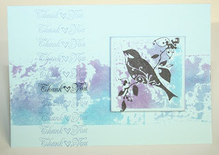 Nadien heb ik nog een vierkantje gestempeld op een appart stukje papier en daarbovenop heb ik met archival inkt het vogeltje gestempeld ( Inkadinkado97625 Birds Galore/Oiseaux à gogo). Dit is op 3D foam gekleefd om het los te maken van de achtergrond.