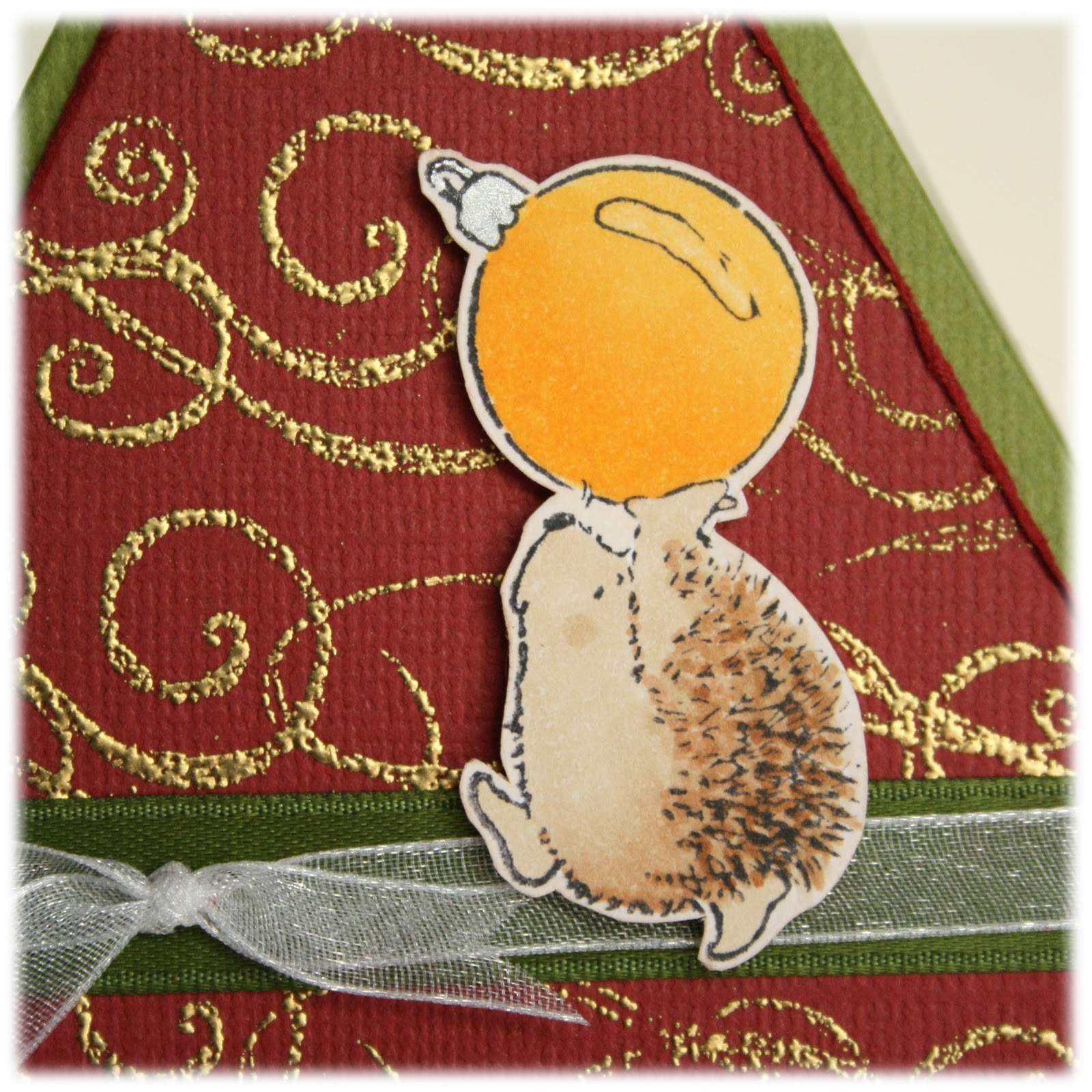 De kerstboompjes zijn gewoon driehoekjes die op zich ook bestempeld zijn met wat verschillende figuren en geëmbossed zijn met gouden peoder.