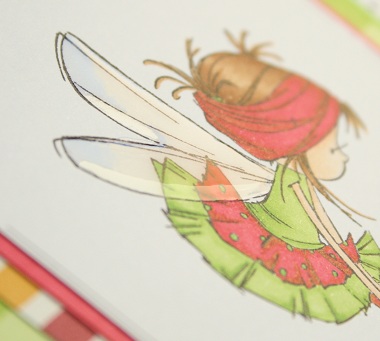 De vleugeltjes werden gewoon ingekleurd met grijs maar mochten natuurlijk ook iets meer hebben. Daarom heb ik er Diamond glaze over gezet zodat ze iets meer als echte vleugels lijken...