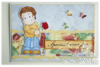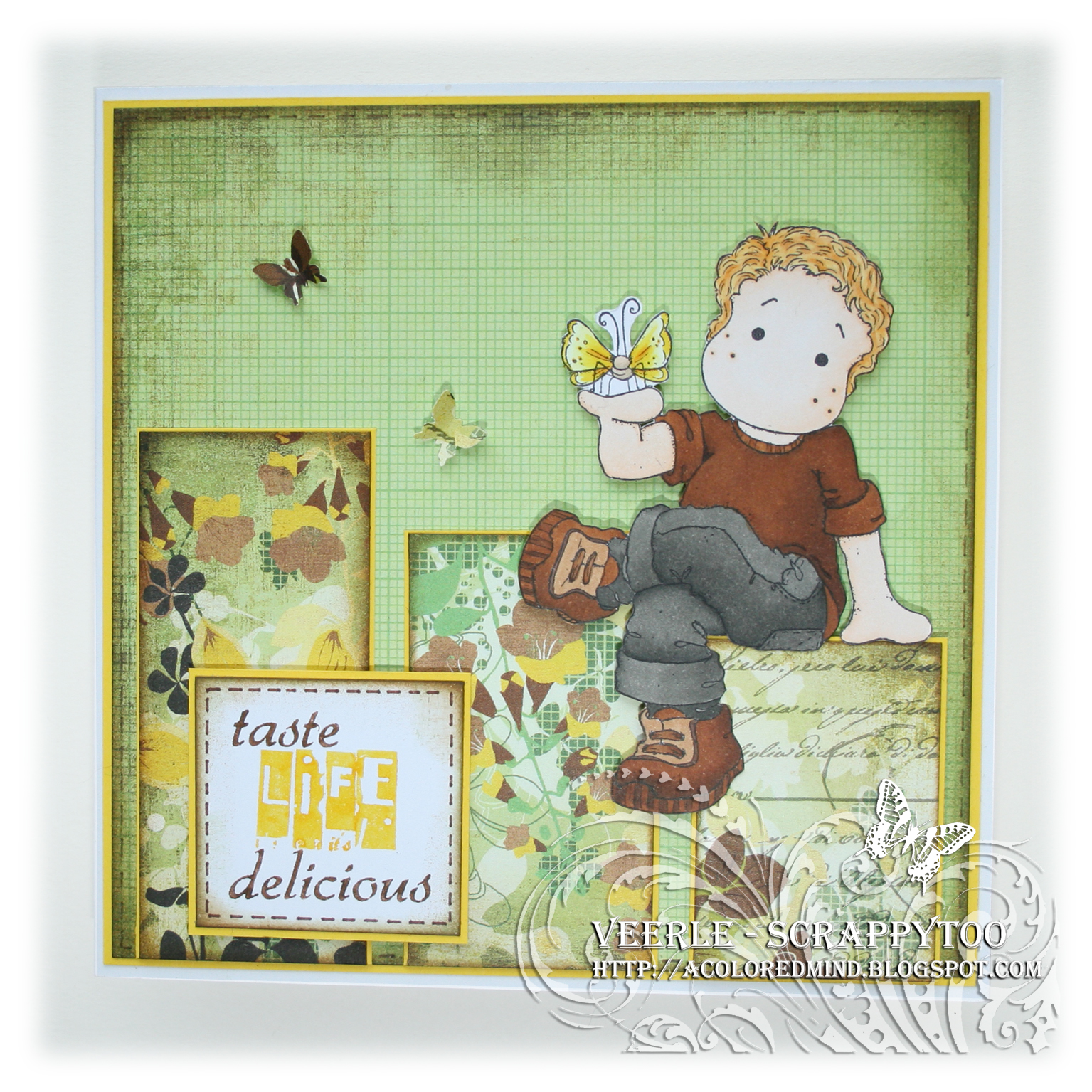 Eigenlijk viel ik als eerste voor de stempel van Edwin met de vlinder op zijn hand en die ligt hier eindelijk ook netjes te wachten om ingekleurd te worden. Maar het werd toch Tilda die als eerste op een kaartje terecht kwam...