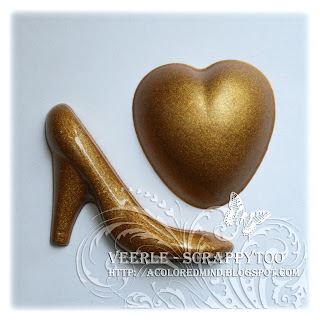 Ik vermelde al dat de mallen van Gédéo die eind deze maand in de winkels zouden moeten liggen een heel mooi blinkende afwerking geven aan de werkstukken. Nou om dat te laten zien heb ik een schoen uit de Gédéomallen naast een hartje uit een matte mal gefotografeerd...