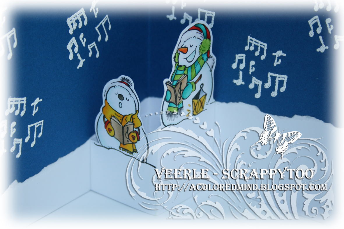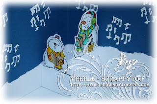 Voor de buitenkant maakte ik gebruik van een stempel van artemio die ik na het inkleuren verhoogd op kleefde om hem los te laten komen van de achtergrond. De witte rand maakte ik met wit embossingpoeder en de sneeuw kreeg een glitterlaagje.