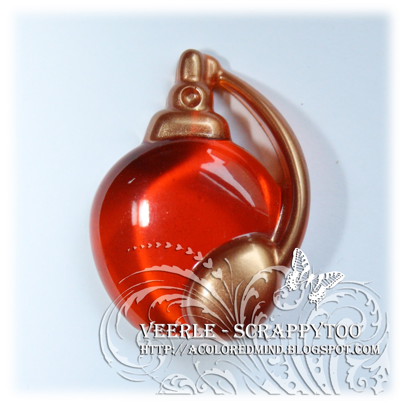 Mijn eerste experiment was eigenlijk een parfumflesje waar ik de perfect pearls in een mal van Gédéo aanbracht met een penseel om er daarna hars-résine in te gieten. Deze hars is vloeibaarder en hierbij moet je echt een mal gebruiken waarin het kan drogen.