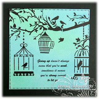 Al enkele weken speel ik met het idee om op kleine kaartjes verschillende technieken toe te passen en daar elke keer een quote aan te koppelen. Het mapje is gemaakt en er zijn een ganse hoop zwarte basis pagina's gesneden waarop de kaarten gekleefd kunnen worden. Ik heb er ondertussen werk van gemaakt en een paar technieken op papier gezet...alleen zijn er nog een paar waar ik mijn quote bij moet zetten. Eentje is er wel al klaar maar daar zat niet zo heel veel werk in ;-) Desalnietemin vind ik het eindresultaat wel mooi geworden.