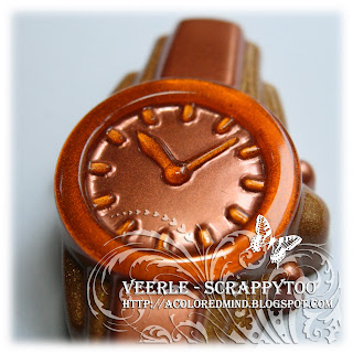 Toen ik het parfumflesje aan het maken was had ik een klein beetje van de oranje hars in een andere mal aangebracht. Tenminste in een deeltje van de mal: de wijzers en "cijfers" van het uurwerk en de cirkel rond de wijzersplaat. Toen dat de dag nadien echt goed droog was heb ik opnieuw wat perfect pearls aangebracht en toen heb ik er gouden hars ingegoten. Duimen op full speed gezet dat alles goed aan elkaar hechtte en toen ik de dag nadien mijn mal losmaakte kreeg ik...