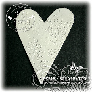 De vlinder werd met een stans uit krimpie dinkie gehaald, gekleurd met colorbox en met stazon bestempeld voor hij werd gekrompen. Niet vergeten om er een gaatje in te ponsen voor het verhitten zodat het lint er door kan gehaald worden ;-)