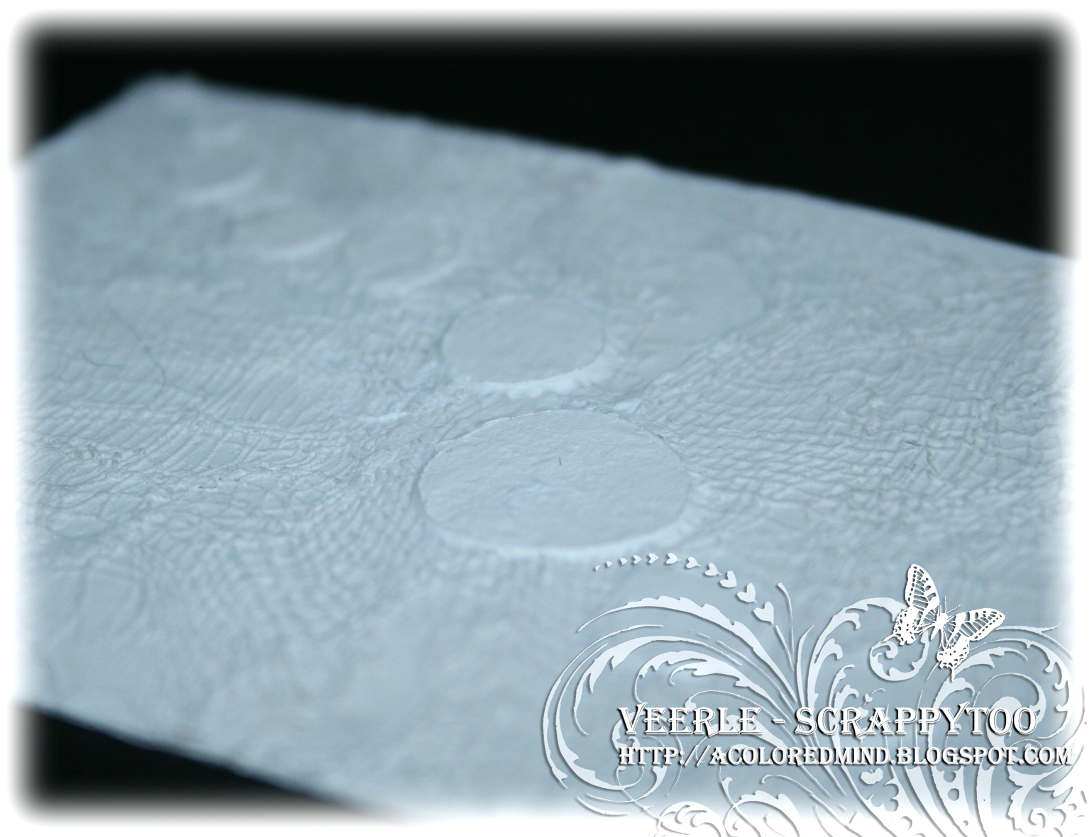 Dus de eerste stap was textuur aanbrengen op de ATC. Eerst wat verband opgekleefd en nadien met een mal en gesso de cirkels aangebracht in een dikke laag :-)