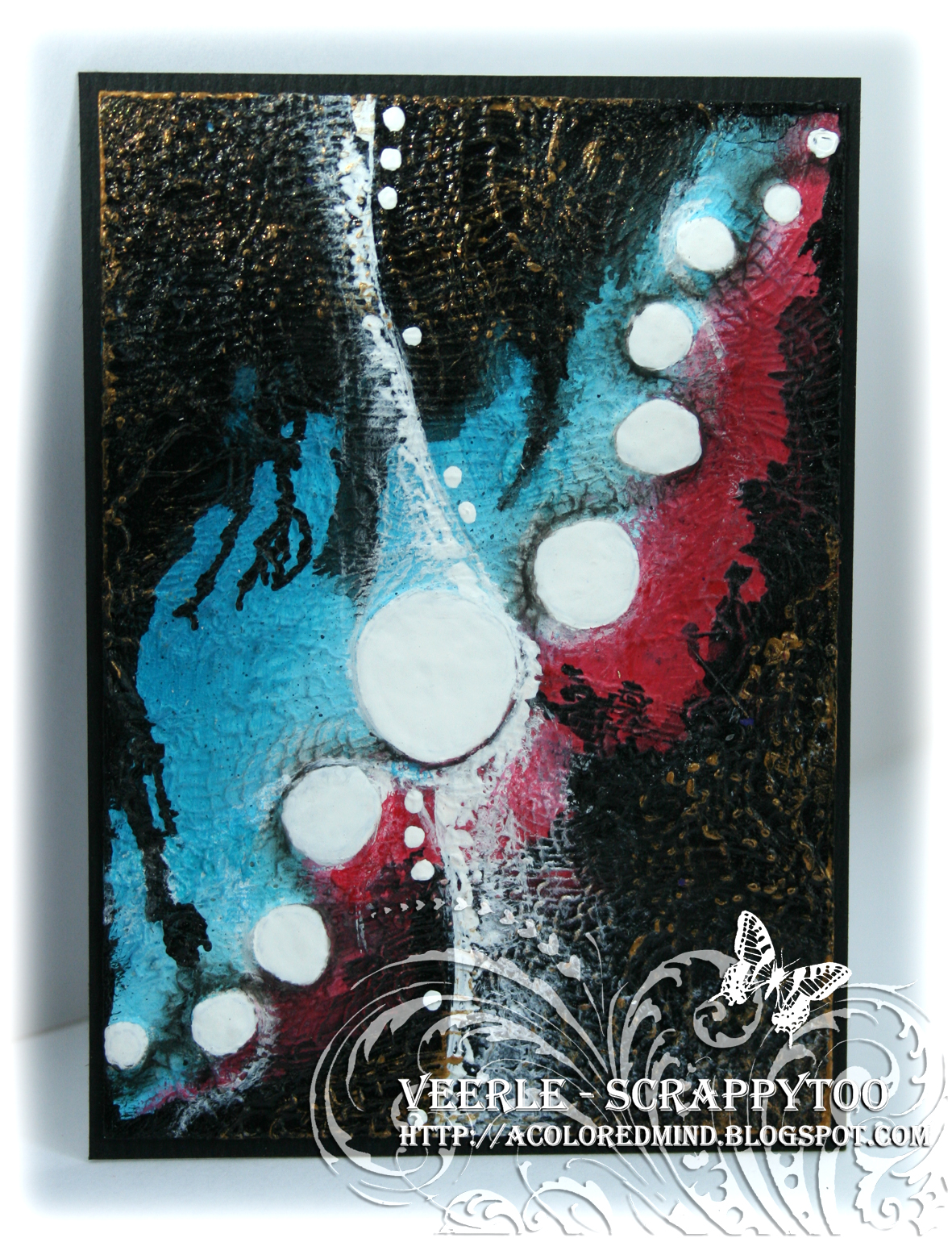 Didn't create a lot this new year but I did try out a new technique. Just onto an ATC to see if I like the result. It gave me really black fingers but do I love the result! Love the structure, it feels nice,... it's hard to describe but I really like it.