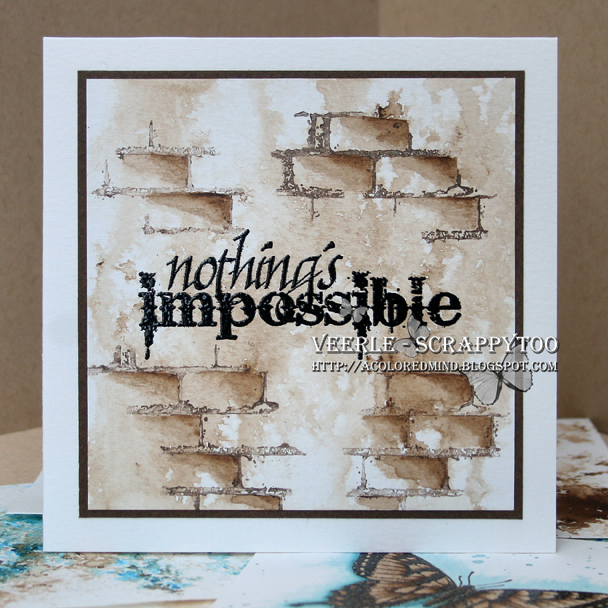 I used a leftover of the purple colored paper  to cut out a square as my backgroundpaper. Using a Zig art and graphic nr 34 I inked up a stamp with a text that fits this project. Just breath onto the inked up stamp to be sure you get a nice and crisp image since you are working with watercolor paper that has texture.